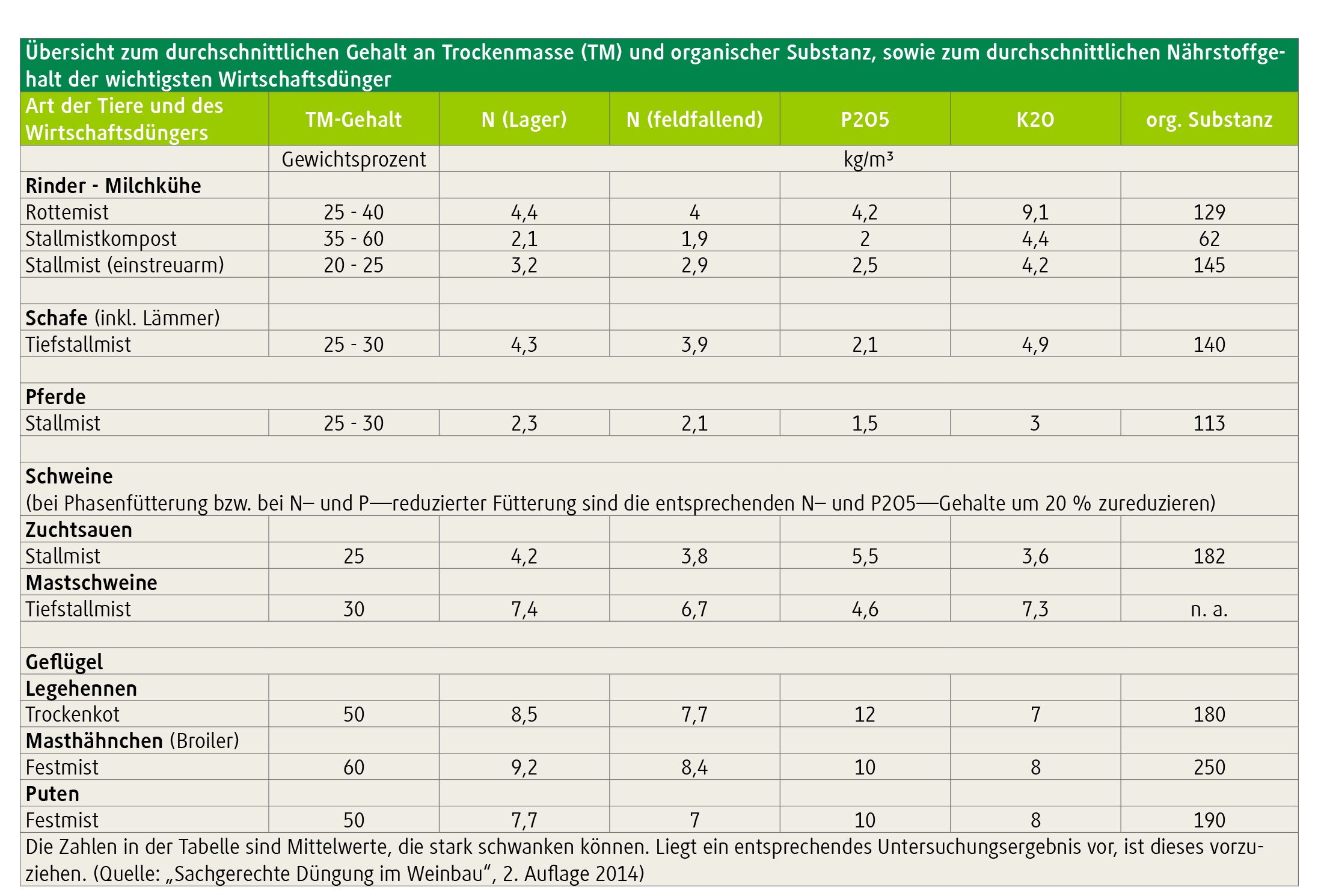Mit Hilfe der Werte in der Tabelle kann der Gehalt an feldfallendem Stickstoff in den Gehalt an jahreswirksamen Stickstoff umgerechnet werden. (Quelle: „Sachgerechte Düngung im Weinbau, 2. Auflage 2014)